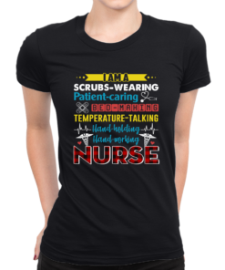Women’s Fashion T Shirts I Am A Scrubs Wearing Patient Caring Bed Making Temperature Taking Nurse